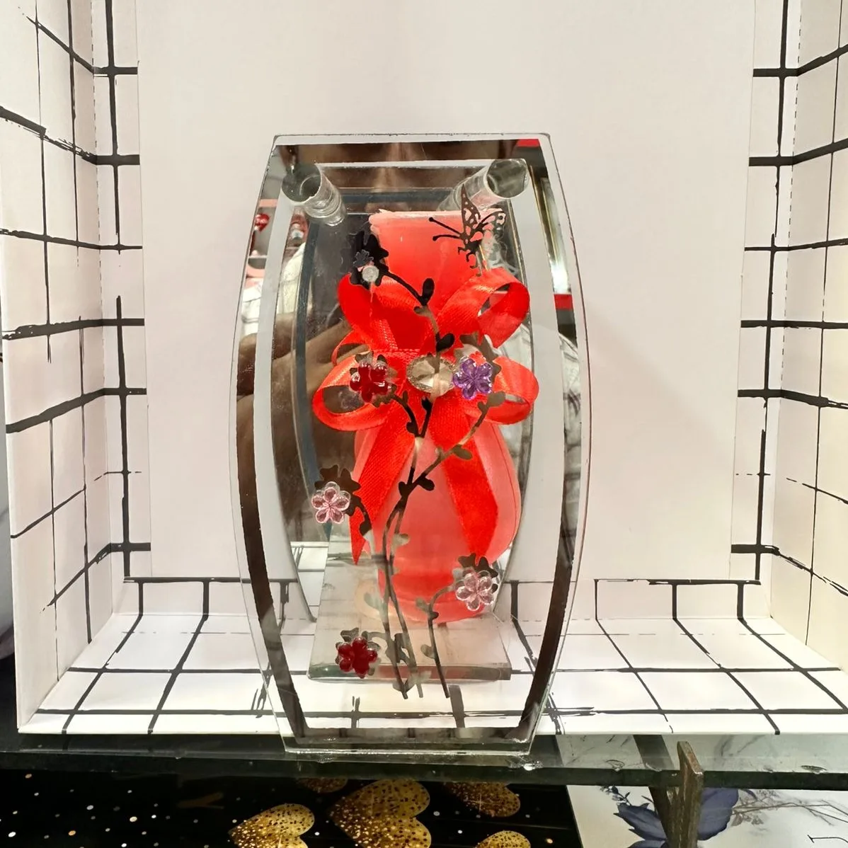 Elegant decorative glass flower vase showpiece with artificial floral design and ribbon detailing. Perfect for home décor, romantic gifting, and special occasions.